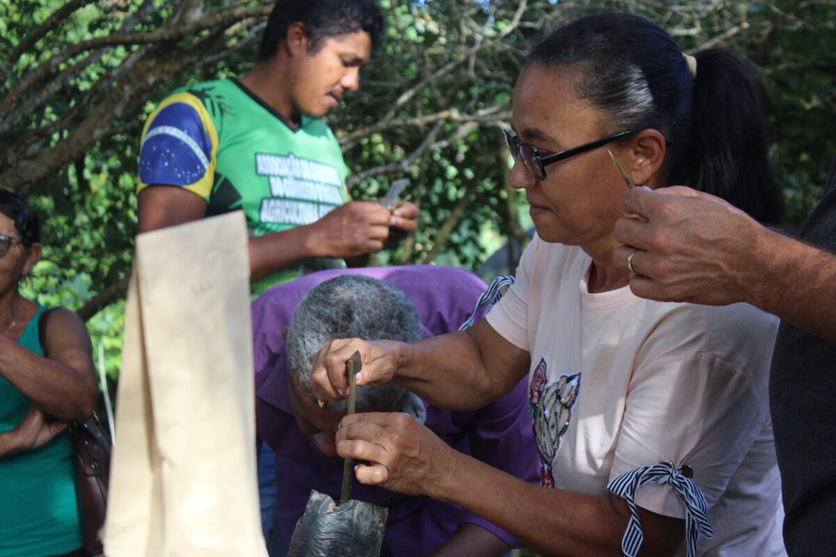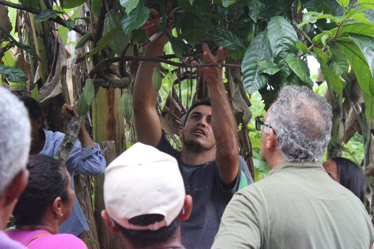 O primeiro momento da oficina foi uma roda de conversa sobre a produtividade do cacau em sistemas agroflorestais (SAF), prática que combina a produção sem o uso de químicos e contribui na preservação de nascentes e áreas degradadas. O segundo momento foi a parte prática de manejo e clonagem de cacau realizado nas áreas de produção da comunidade.