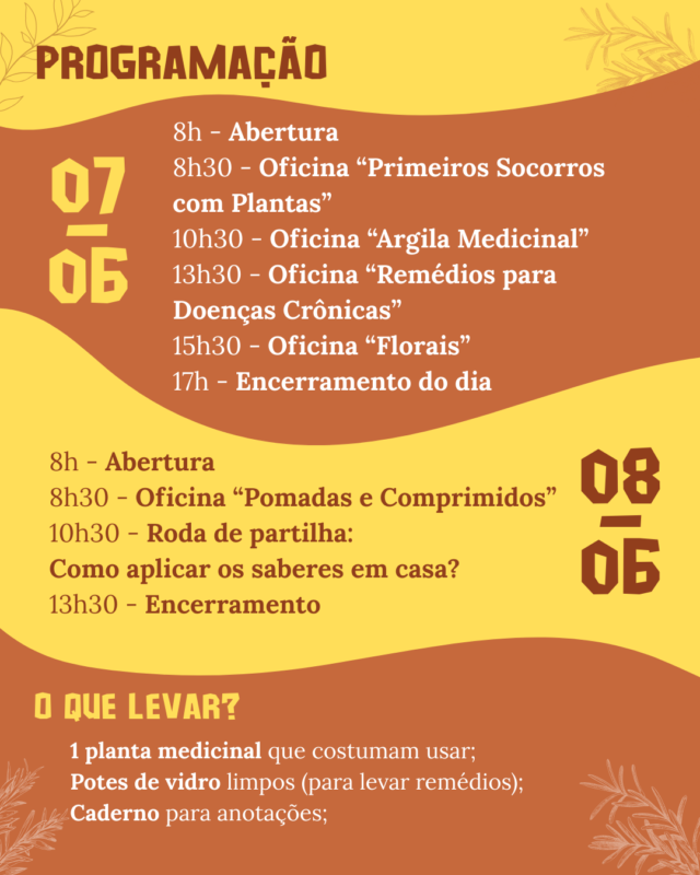 Não esqueça de trazer: uma planta medicinal que você costuma usar, potes de vidro limpos para levar os remédios e um caderno para anotações .