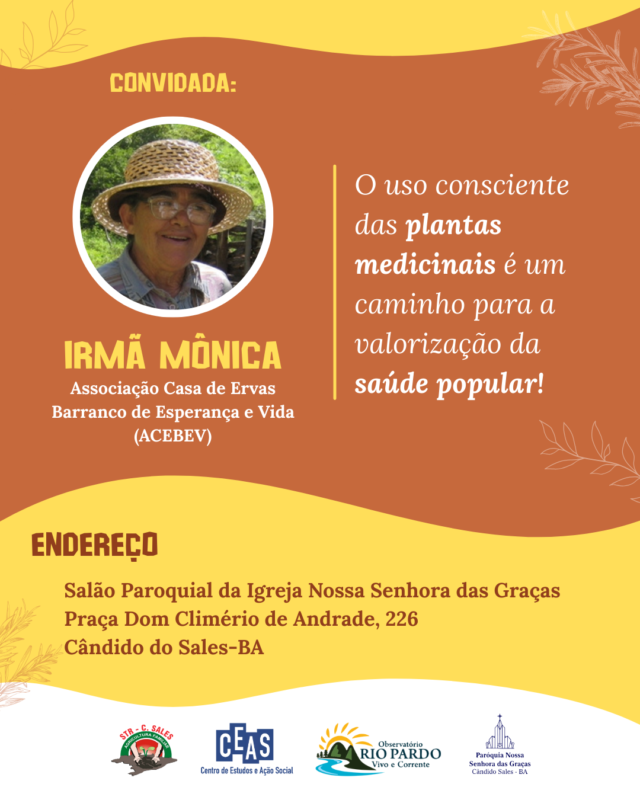 A Articulação Rio Pardo Vivo e Corrente, o Centro de Estudos e Ação Social (CEAS), o Sindicato dos Trabalhadores Rurais de Cândido Sales e a Paróquia Paróquia Nª Srª das Graças convidam todas e todos para o “Encontro de saberes: plantas medicinais e saúde integrativa na prática”!