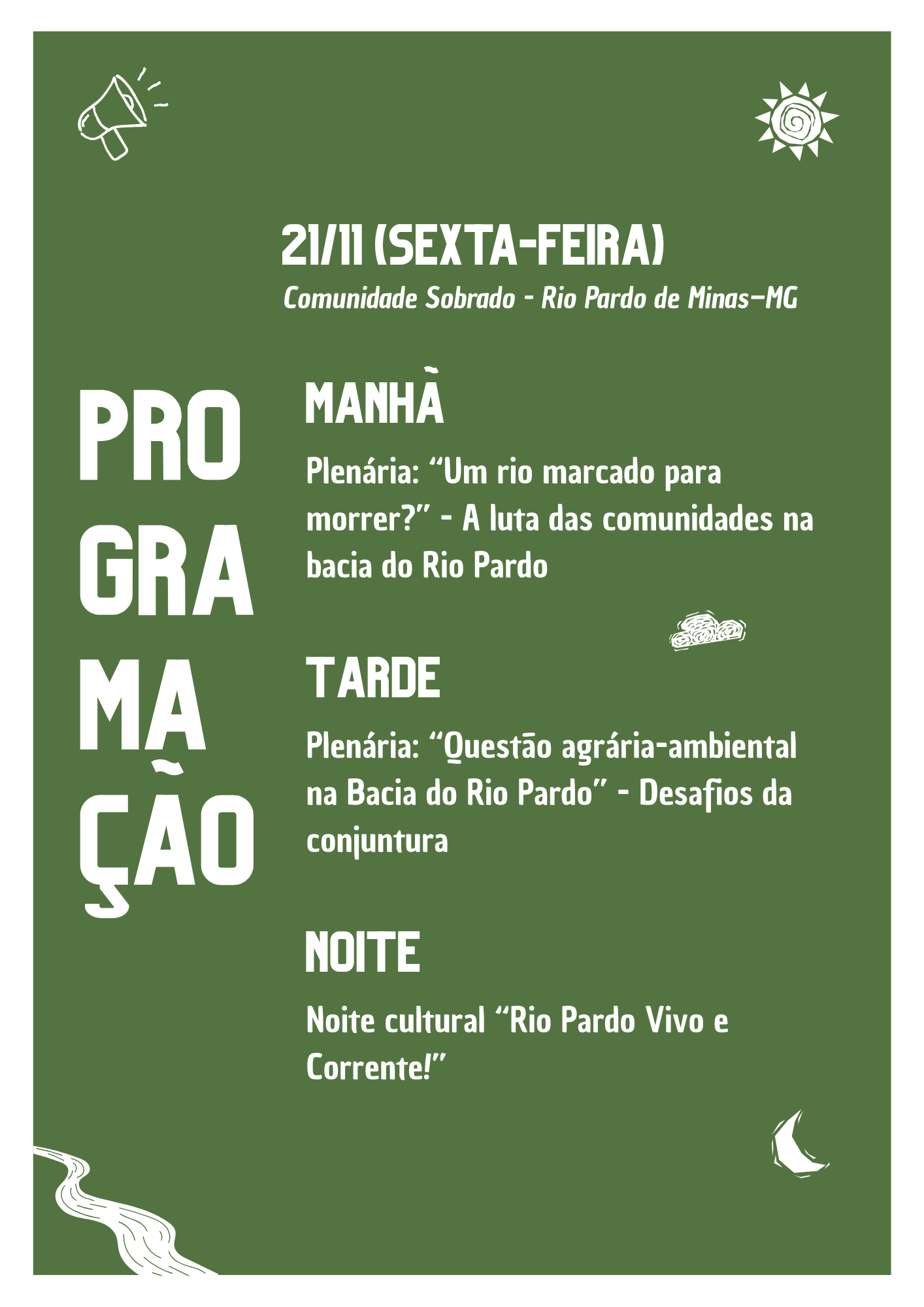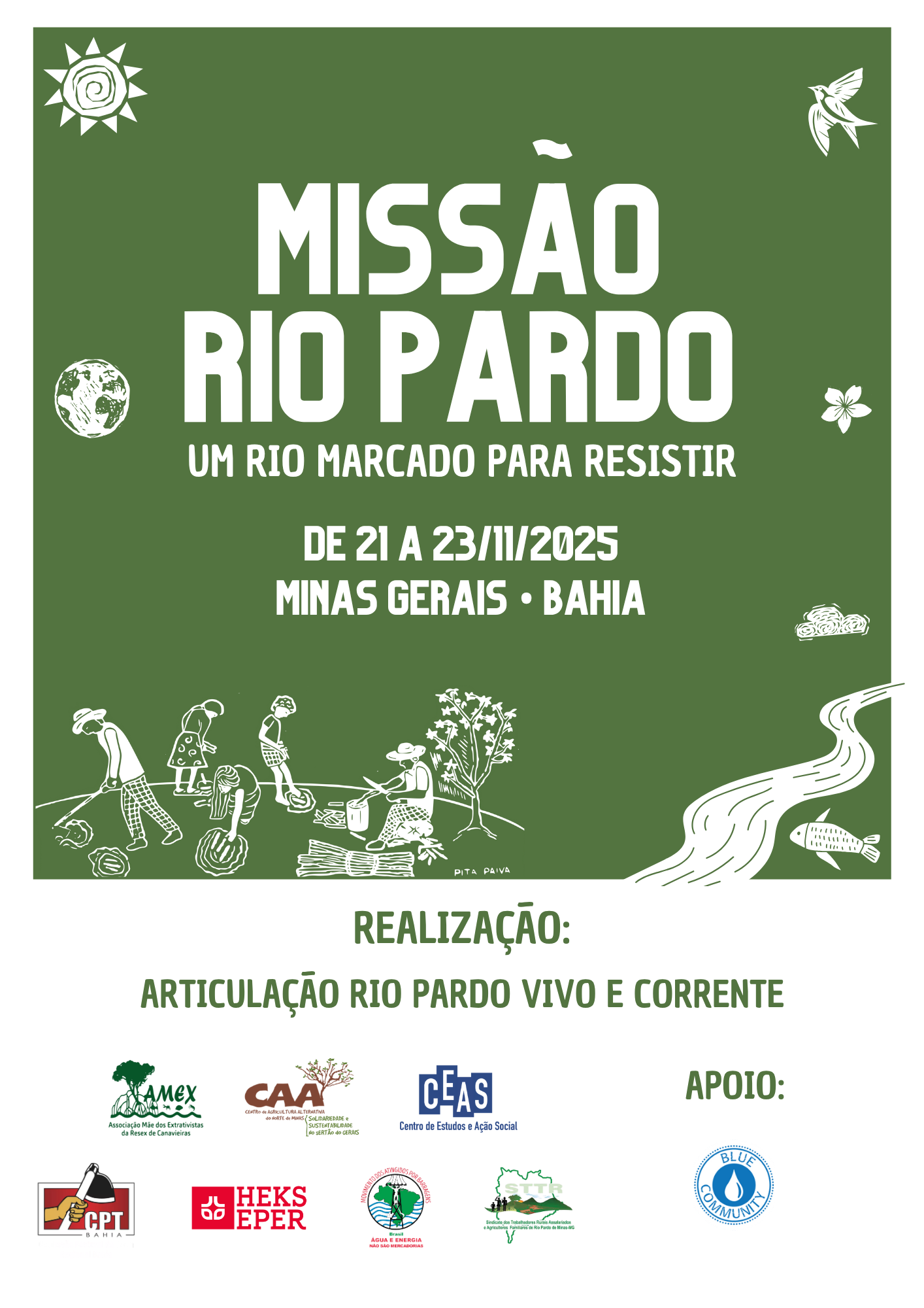 A Articulação Rio Pardo Vivo e Corrente anuncia a realização da “Missão Rio Pardo – Um Rio Marcado para Resistir!”, um intecâmbio que reunirá, entre os dias 21 e 23 de novembro de 2025, representantes de povos e comunidades camponesas e tradicionais, movimentos sociais, ambientalistas e pesquisadores em uma jornada de mobilização pela Bacia do Rio Pardo.