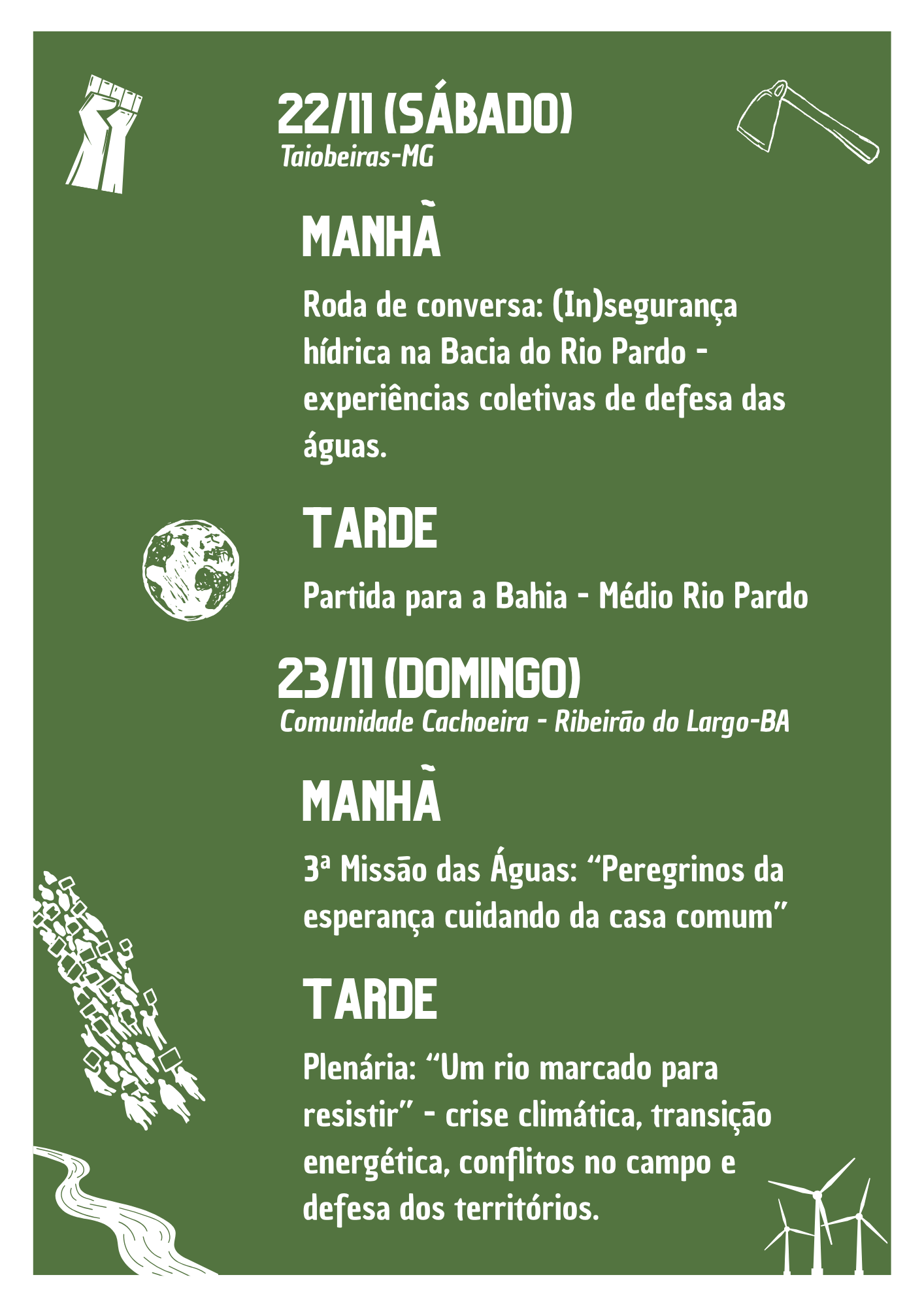 A programação conta com momentos formativos, práticos e políticos, iniciando na comunidade Sobrado, em Rio Pardo de Minas-MG no dia 21, Taiobeiras-MG no dia 22 e na comunidade Cachoeira, Ribeirão do Largo-BA no dia 23. Nesta etapa a Missão se encontra com a 3ª Missão das Águas, evento anual da comunidade que debate preservação ambiental e defesa dos territórios.